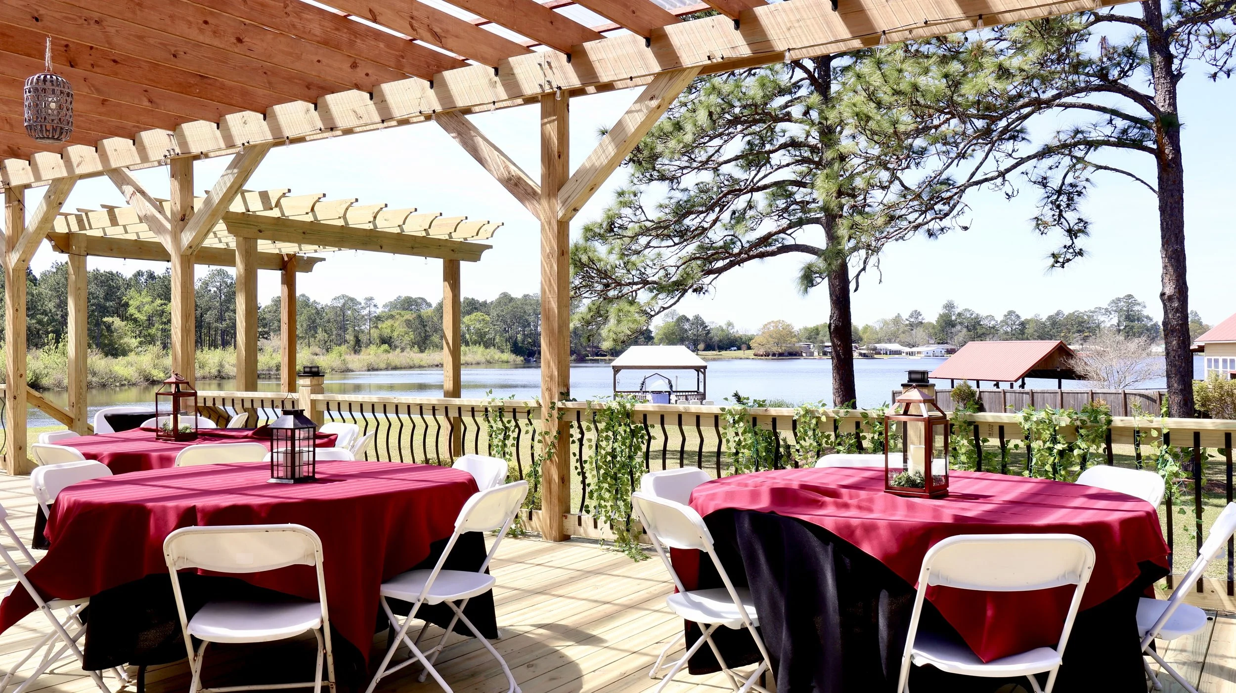 Beautiful covered terrace with lake views, accommodating up to 100 additional guests, ideal for enjoying an outdoor setting with comfort and elegance.